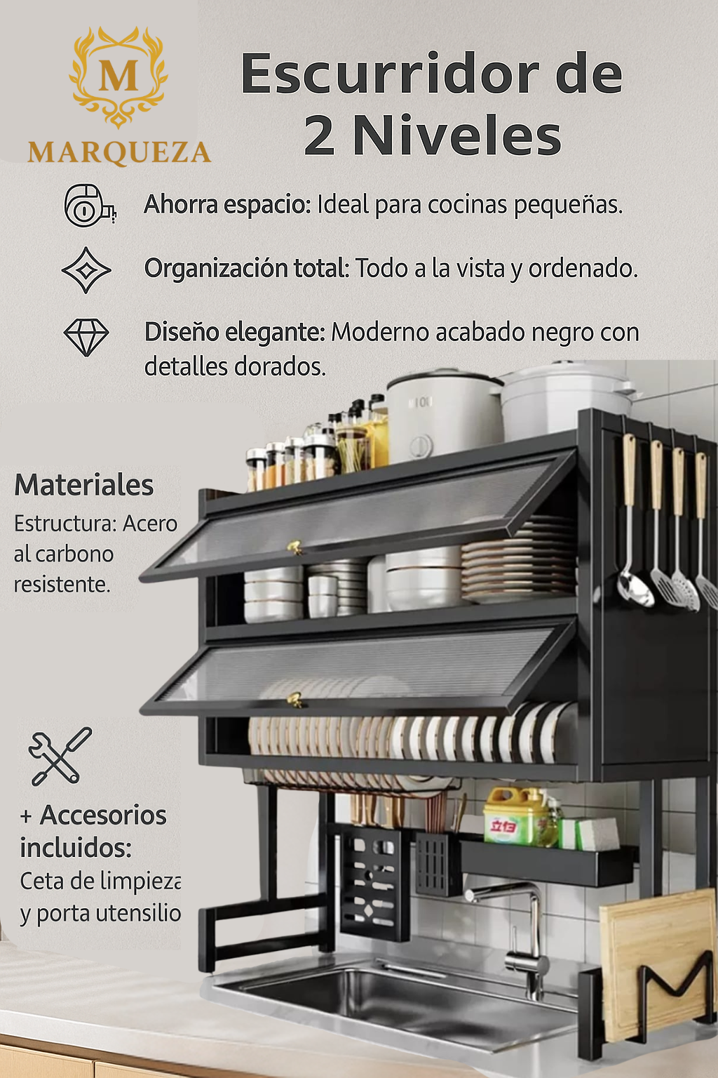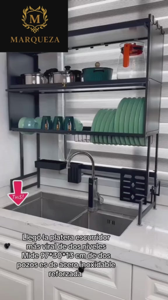 Mantén cada plato, utensilio y accesorio siempre visible y en orden con este escurridor de 2 niveles. Ahorra espacio, luce elegante y transforma tu cocina en un lugar práctico y moderno.